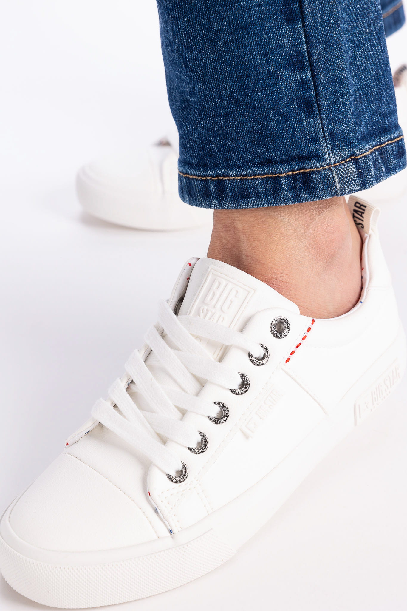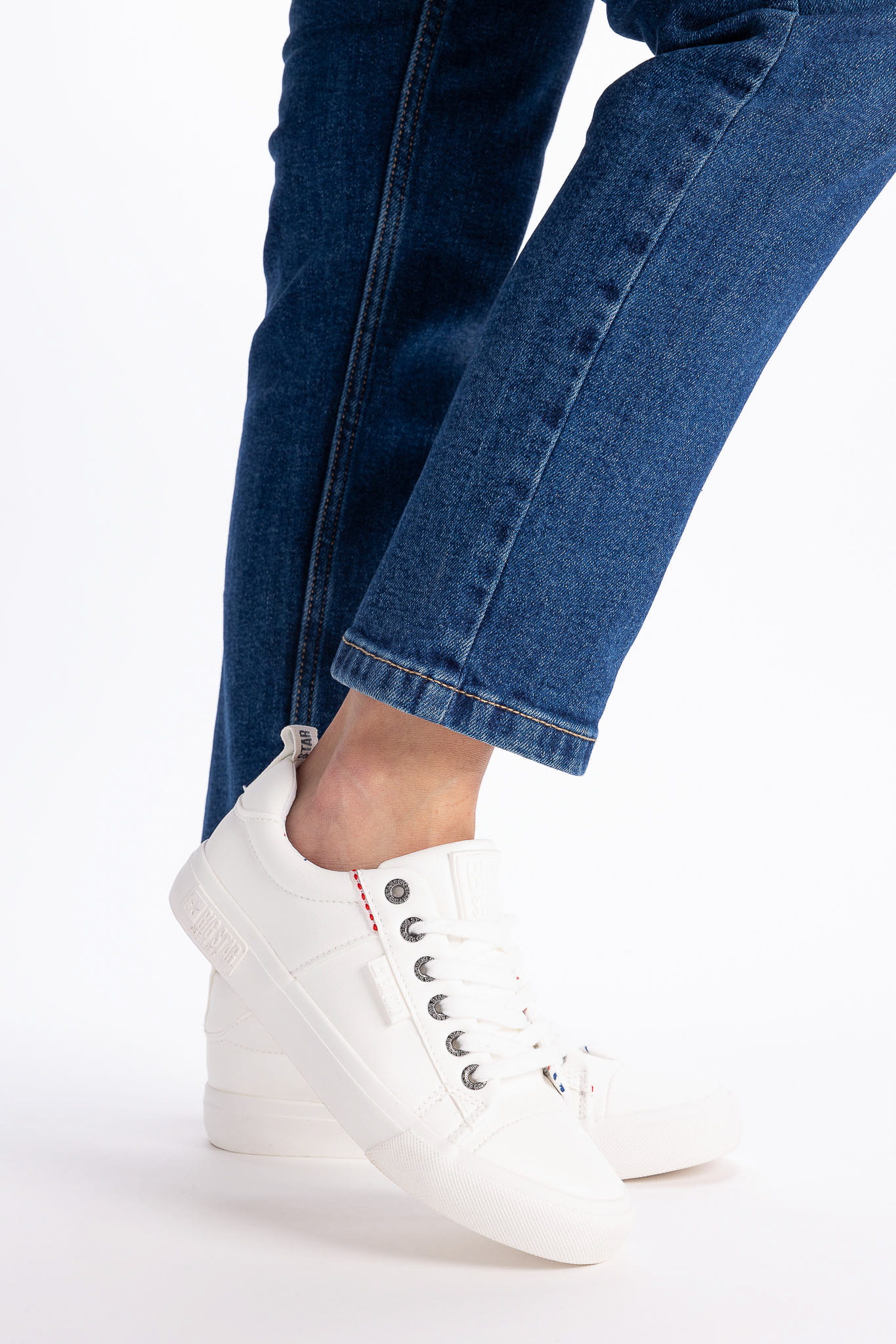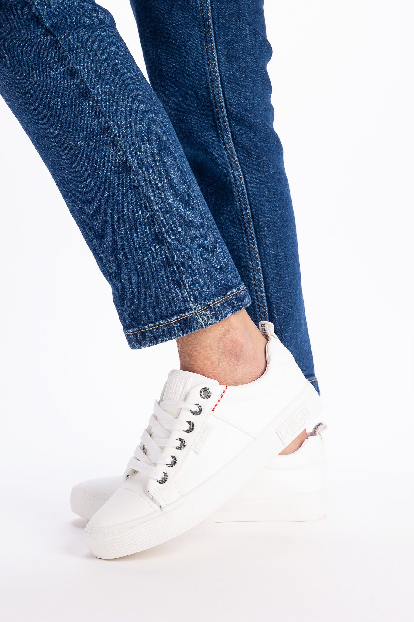 Trampki nadają całej stylizacji lekkiego, wręcz młodzieżowego charakteru. W tym przypadku płaska, gumowa podeszwa zapewnia komfort noszenia. Model wykonany z materiału tekstylnego.