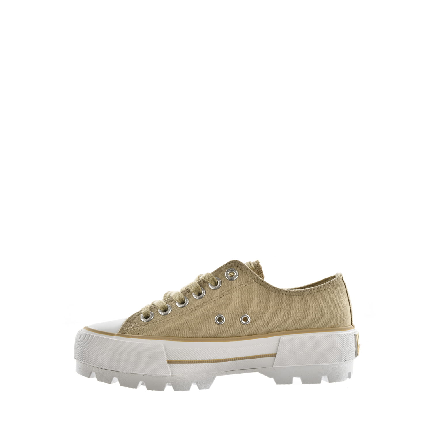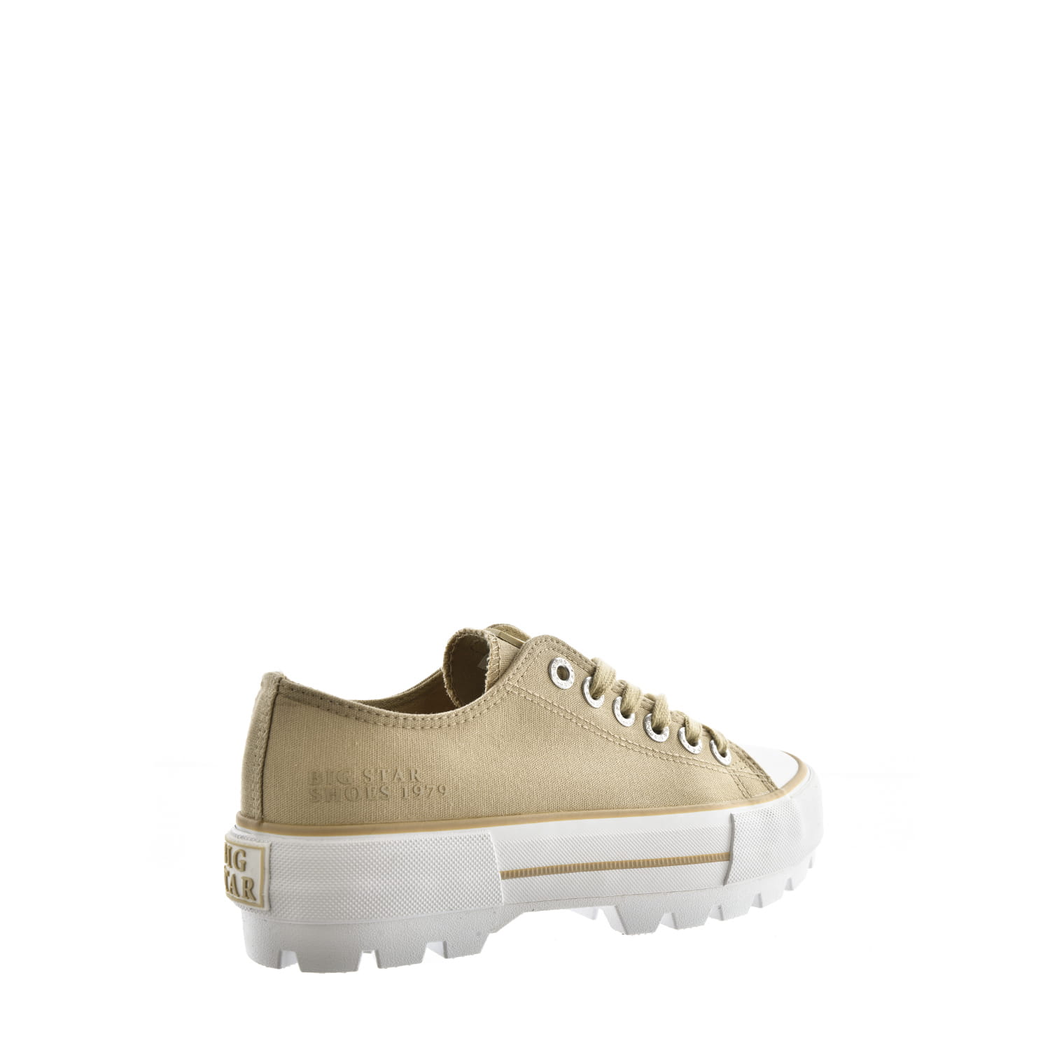 Trampki nadają całej stylizacji lekkiego, wręcz młodzieżowego charakteru. W tym przypadku płaska, gumowa podeszwa zapewnia komfort noszenia. Model wykonany z materiału tekstylnego.